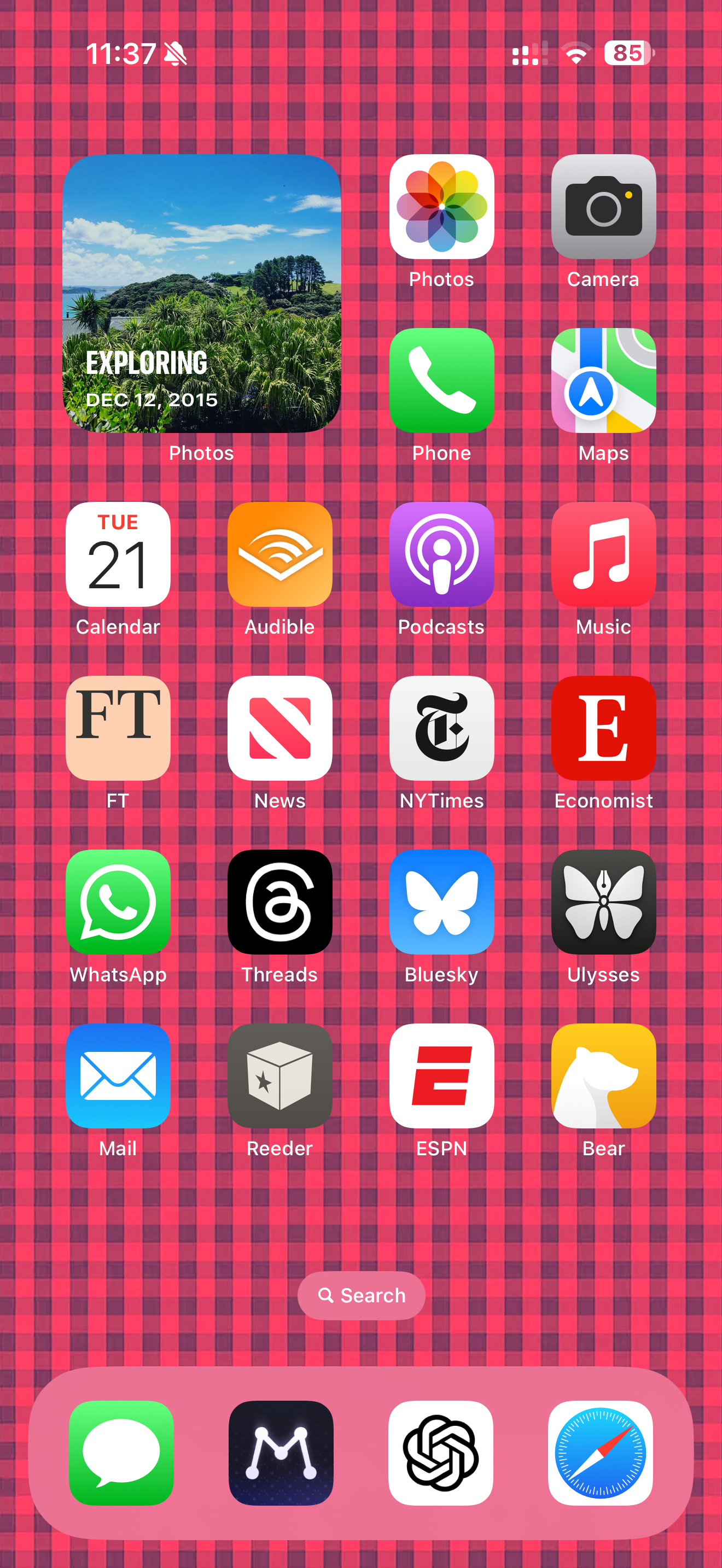Messages remains as does Safari. But whereas last year featured Threads, this year slots in Matter and yes, ChatGPT. You'll note that I simply moved Threads up onto the main screen. I'm still using it quite often, but with the rise of Bluesky, I've been sort of splitting time between those two. And while Threads took the place of Twitter last year, when it changed to Xitter, and got much worse as a useful source of news and information, in my opinion, all such usage has now splintered in a thousand directions and apps.