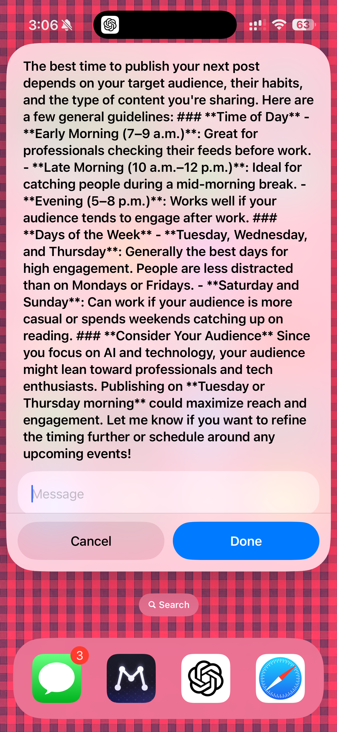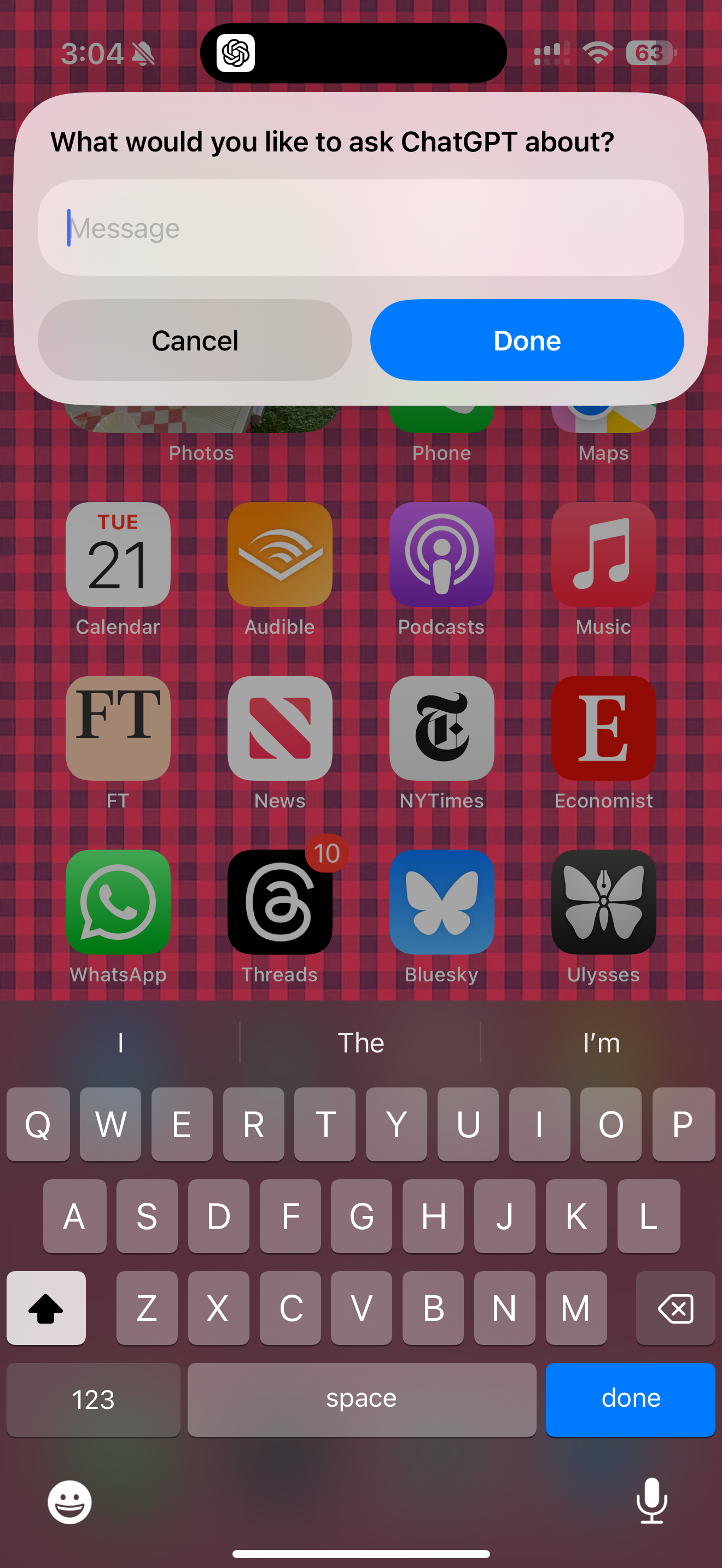One more thing: whereas last year I had the Action Button set to trigger the Notes app, now I have it set to trigger, what else, ChatGPT. What's nice is that as with the Notes app, you can have this trigger a simple overlay text box, rather than taking you into the app (though you can do this as well). And then it works in the background as you keep doing whatever you were doing. The results aren't as pretty (I mean that literally) as they are inside of ChatGPT, but it works well. You can also set it to go right into 'voice mode' as well – though this requires you load the app, of course.