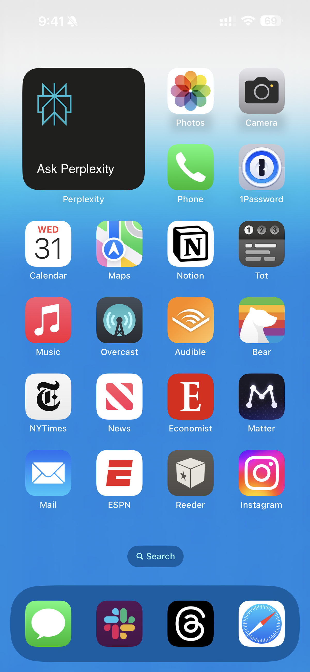 Moving along, the top portion of my homescreen is similar other than moving 1Password to my second screen. Below that, both Tot and Notion also shifted to the second screen as I simply didn't need that many note-taking apps at a moments notice, as it turns out. I also swapped Overcast for Apple's own Podcasts app. As you can see over the years, I'm constantly moving back and forth between them, trying to see which I like better with each iOS update. Right now, it's Podcasts, but it may and probably will change again.
