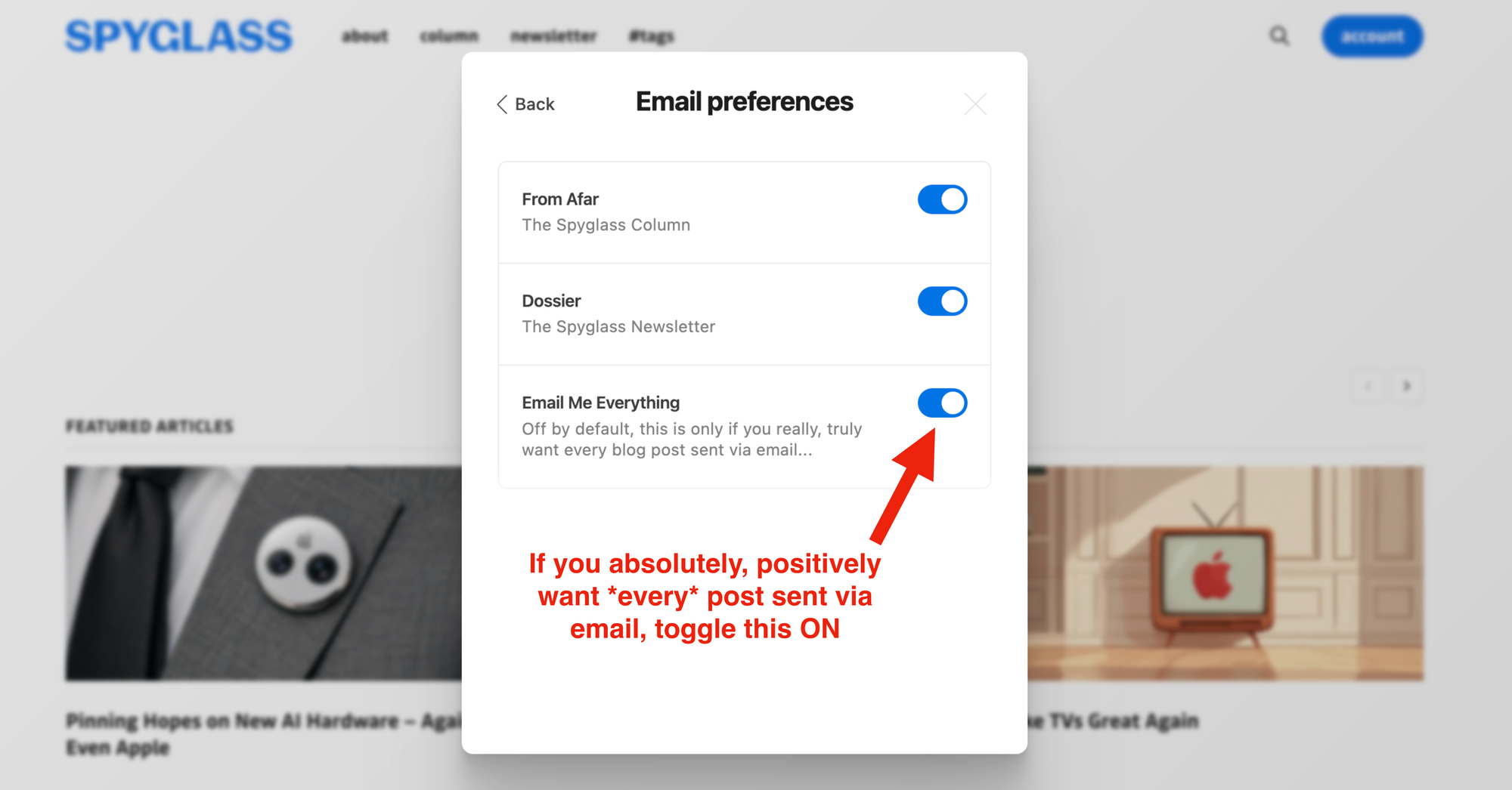 If you really, truly want to receive every post – the column, all the blog posts – in your inbox, members can do so by clicking here and toggling on the 'Email Me Everything' slider. This is off by default as it will mean a decent amount of regular email in your inbox. And I already include links to such posts in the newsletter. But I know some people prefer this method of delivery, so... enjoy?