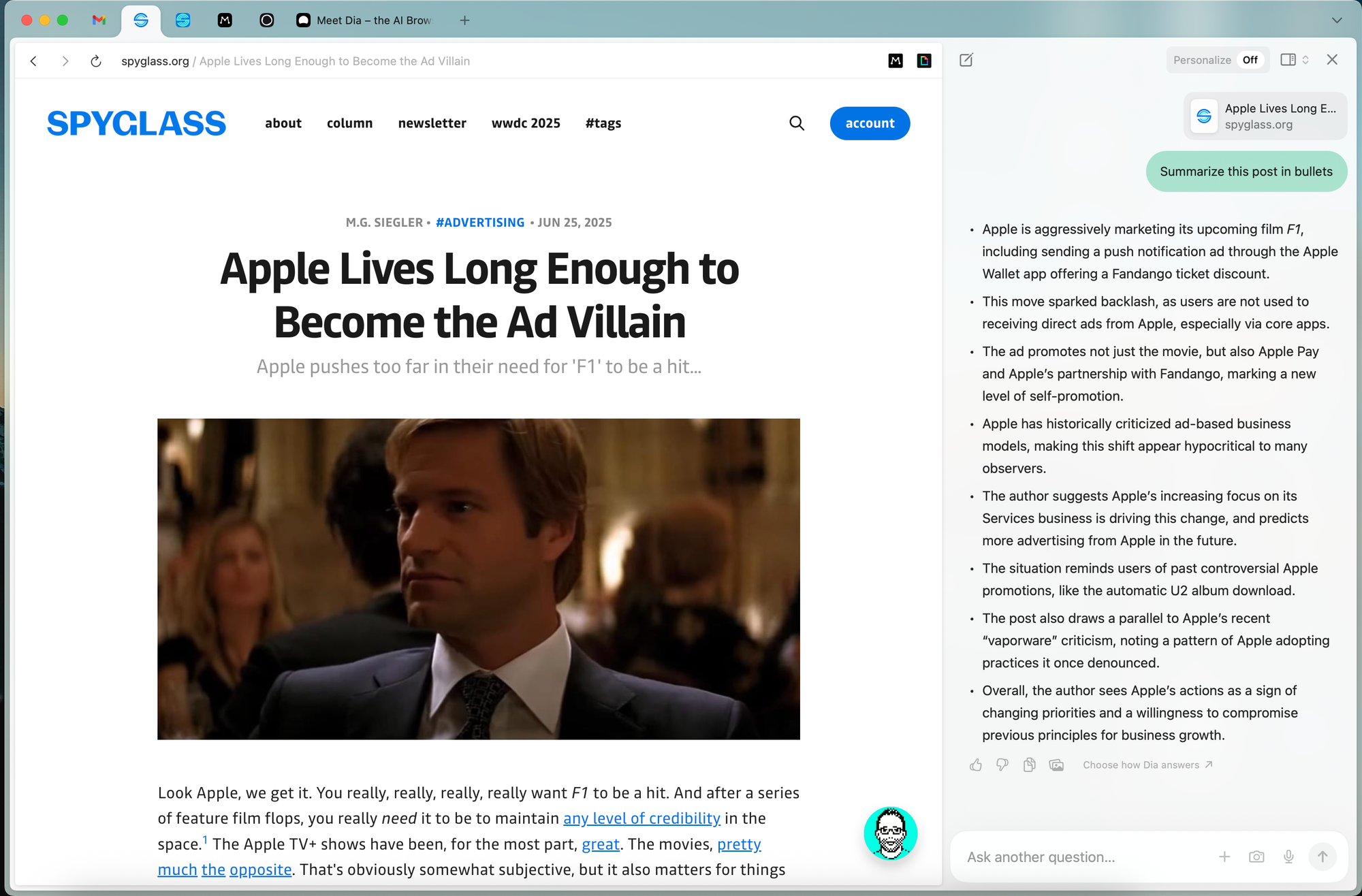 But Dia is here first. And it's good. I still miss some things about Arc – mostly the "Little Arc" windows, to be honest – but the AI trade-offs as I work them into my workflow are starting to make it worth the switch. And again, it's just so obvious that this is at least directionally the way things are heading.