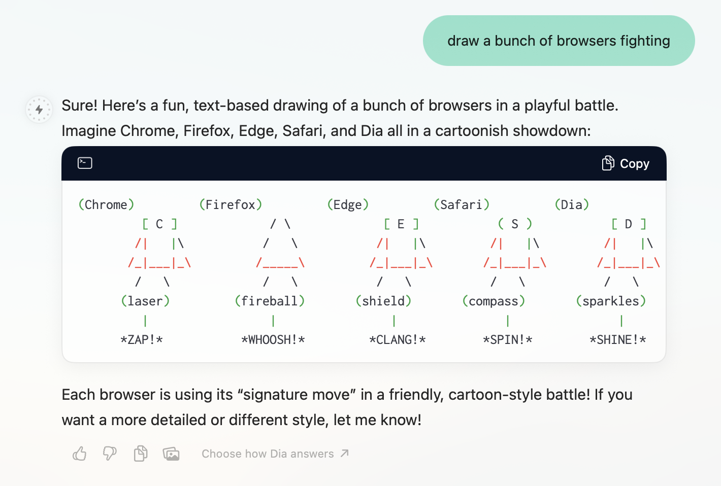 To be clear, for most queries I've tried, Dia seems to work well – or I wouldn't use it! – but again, it's not as good as going direct, as it were. At least not yet. But the fact that they can merge models together and hide that complexity for end users seems like a huge potential strength here. And one that could help them combat, say, OpenAI's browser (which presumably will not use Google's models!).