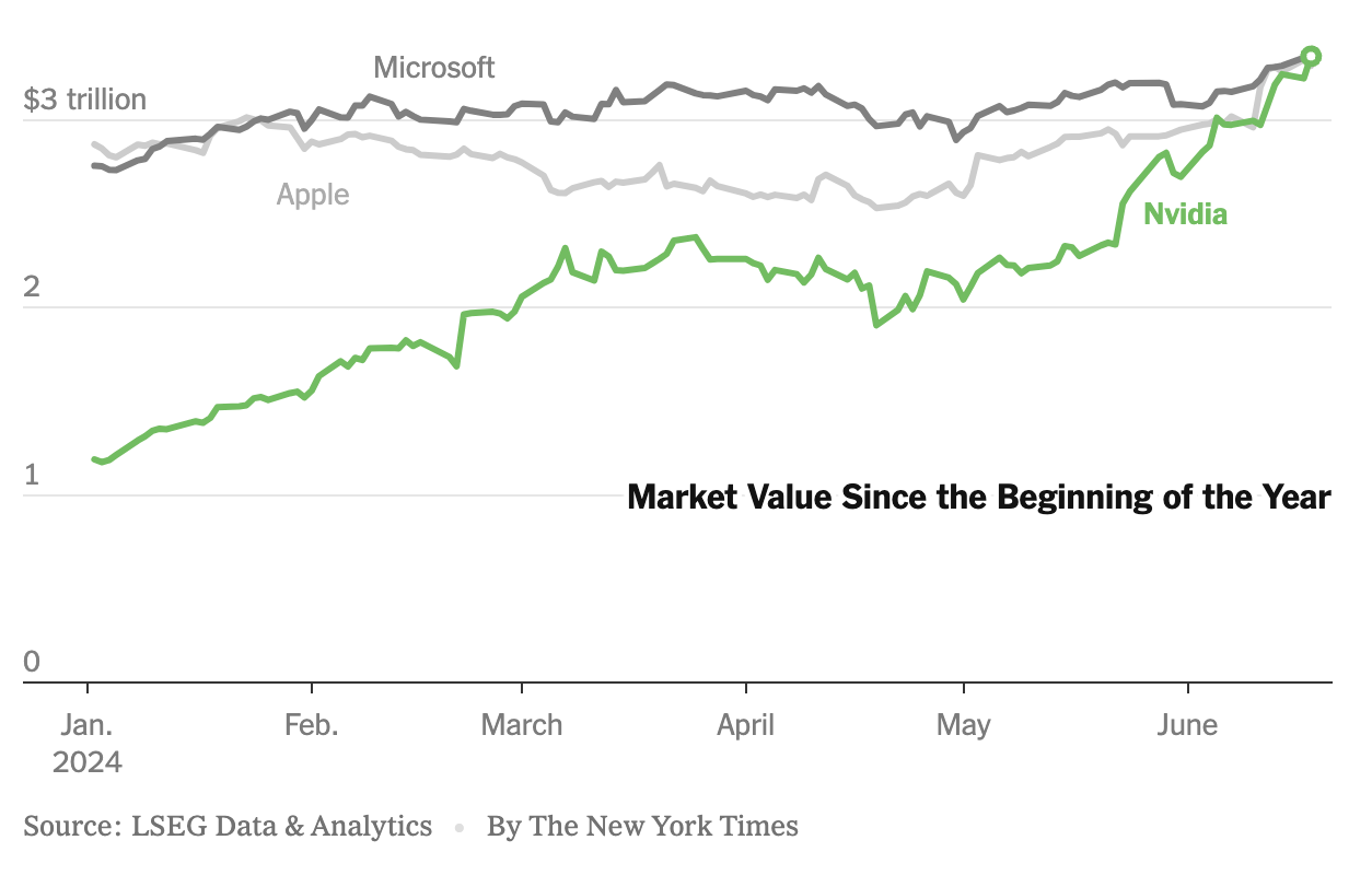 The speed at which Nvidia’s value has grown has been startling. Apple crossed $1 trillion in August 2018 and became the first $3 trillion company last June. Microsoft also took nearly five years to climb from $1 trillion to $3 trillion.