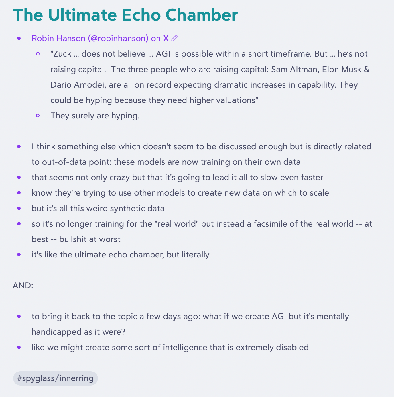 Admittedly, this is a bit above my pay grade, but in thinking about and writing about AI over the past many months, my mind keeps going back to a place where I'm mildly disturbed by the concept of "synthetic data" (see: my notes below). Specifically, how because we're running out of "natural" data to train AI models, many are now being trained on data created by other models.