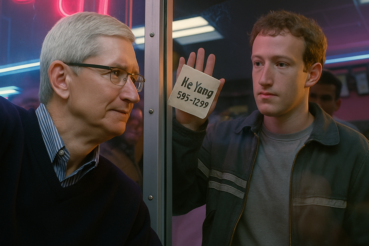 Picture this: Mark Zuckerberg is with his boys walking by the Blue Bottle in Cupertino. He notices Tim Cook inside with a group of Apple employees. He goes over and knocks on the window to get Tim's attention. Zuck shouts through the window, "do you like apples?" Tim nods, "yeah." Zuck pulls out a napkin with the name 'Ke Yang' written on it and slams it against the window. "Well I got your AI guy. How you like them apples?"