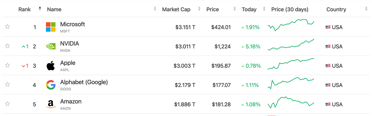 The company is pretty much the last one on Earth to outline their AI strategy. Of course, that approach is nothing new for Apple. And I actually think being a bit slower here will help the company in the long run once again. But it's certainly not helping them right now. Not in the press. And not on Wall Street where they're in a battle with NVIDIA, the AI darling, for the position of second most valuable company in the world. The first, of course, is Microsoft. Why? In no small part thanks to their overall AI narrative.