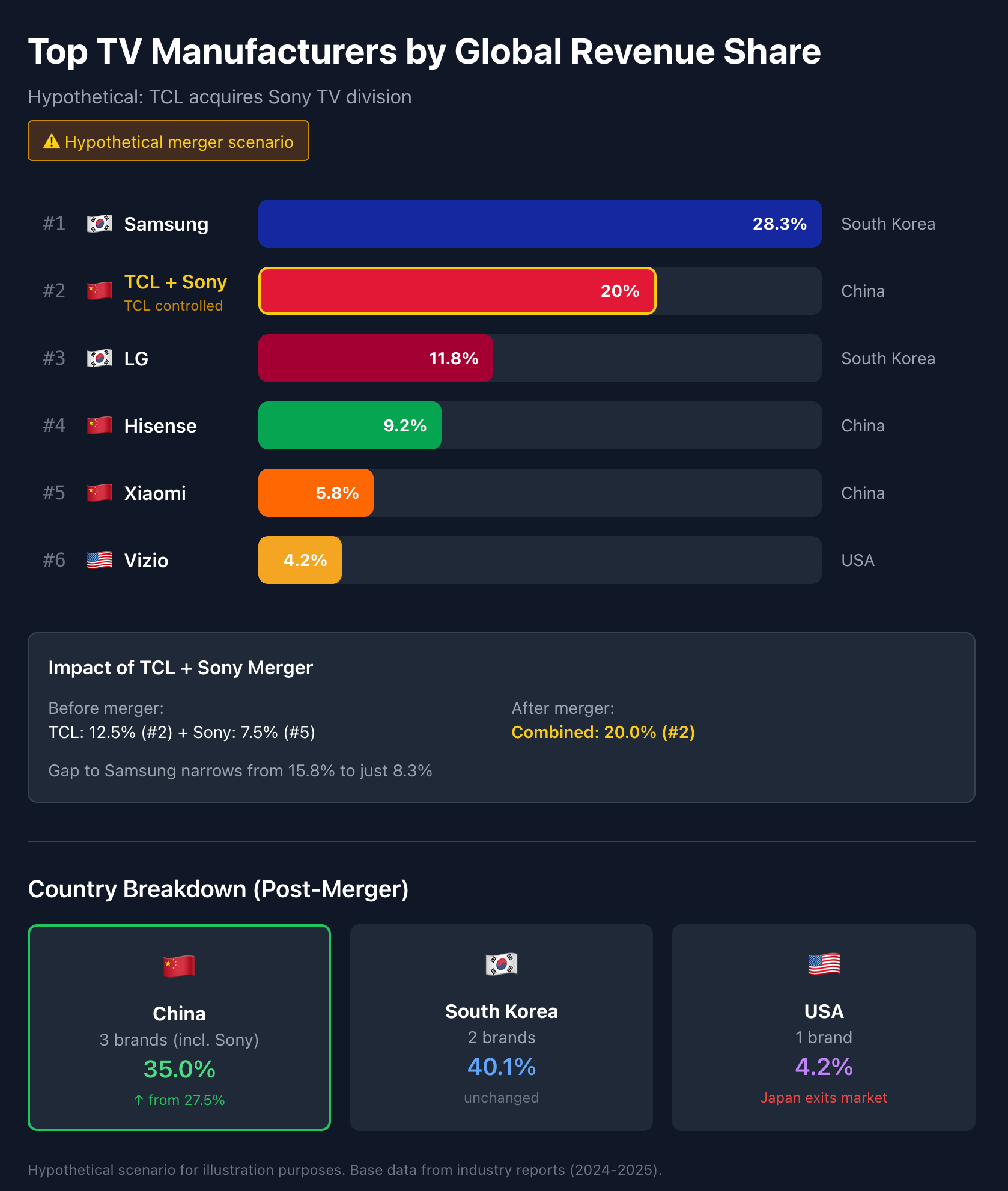 Granted, it has been a long time since Sony dominated in television. By revenue, they're now the number five player in the space, behind Samsung, TCL, LG, and Hisense. TCL was already the number two player, but when Sony is added to their mix, they'll be much closer to Samsung, by far the leader. It will also make for a top 5 that is all Korean or Chinese players (with Xiaomi taking over Sony's spot). Japan, which once utterly dominated television sets, has all but vanished from the market.