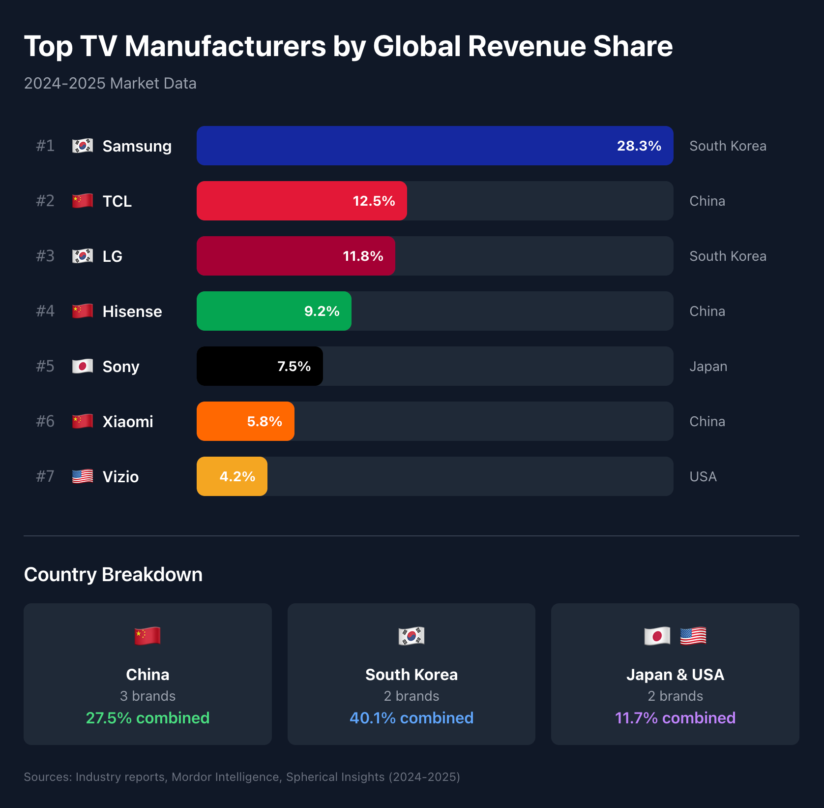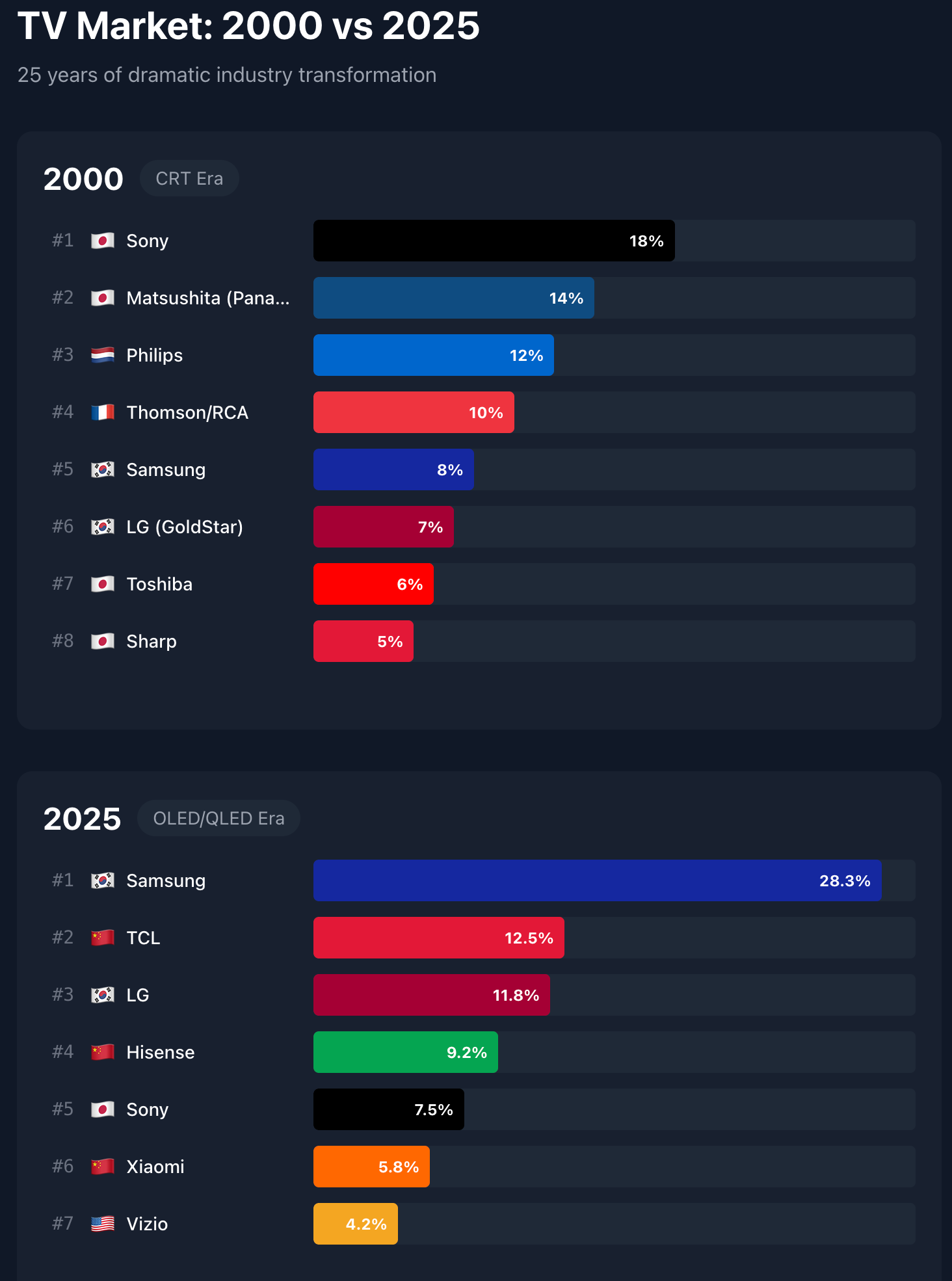 Meanwhile, America, which started the whole industry with RCA in the late 1930s, and completely dominated the first few decades, has basically only one player now, the super affordable (read: cheap) brand Vizio (now owned by Walmart, with the sets themselves obviously made in Asia). Of course, the US hasn't really been a major player since the 1960s, when Japan started to take over. Why? Well, it's complicated, but essentially RCA gave away the keys to the kingdom in exchange for a licensing fee and this started a race to the bottom. To the point where now, famously, it's a sort of crappy business to be in.