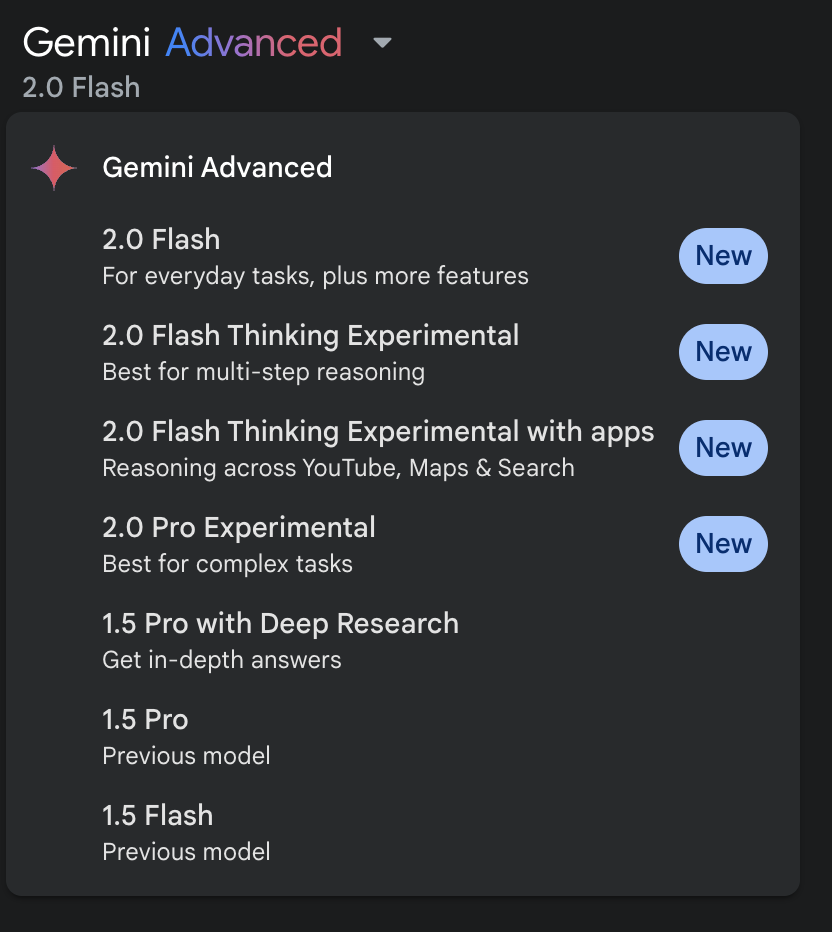 You know who else should do this? Google! Gemini currently has seven options in their model picker drop-down.3 To be fair, they don't have sub-menus, but what they lack there, they make up for with garish "New" glyphs. And as esoteric as OpenAI's model names may be, that's how literal – and, as such, literally bad – Google's are. Looking at you, '2.0 Flash Thinking Experimental with apps'.4