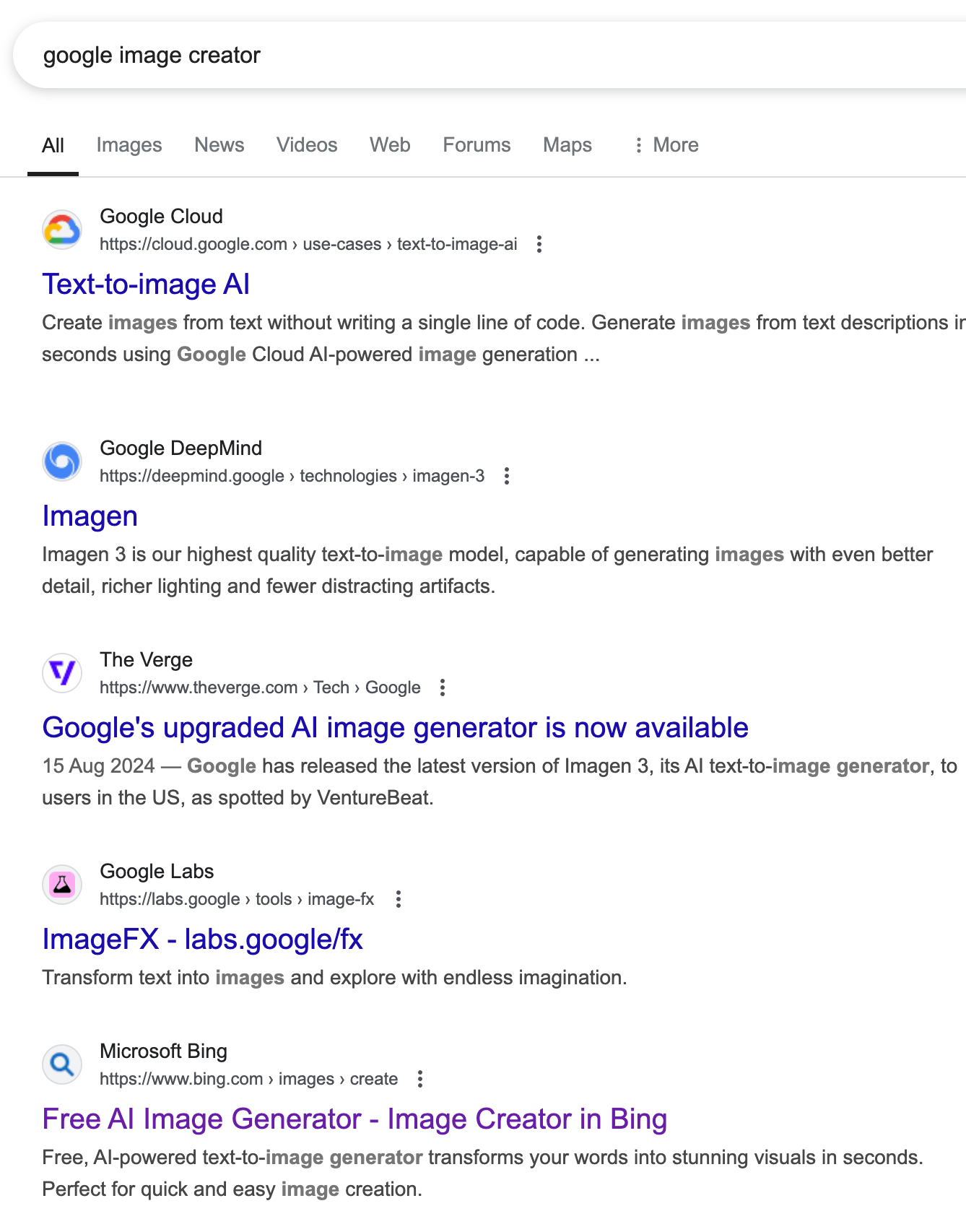 Anyway, just trying Googling "Google image creator" and you'll get some fun results. 'Imagen' is not number one because Google Cloud's 'Text-to-image AI' seemingly has more juice. Imagen is buried as a sub-site on Google's DeepMind sub-site. That site tells you that you can use it in Gemini (which is not obvious, but how it should be – and zero of the top results mention Gemini) or that you can try it on ImageFX, yet another sub-site of yet another sub-site: this time, Google Labs. Why? Nobody knows.