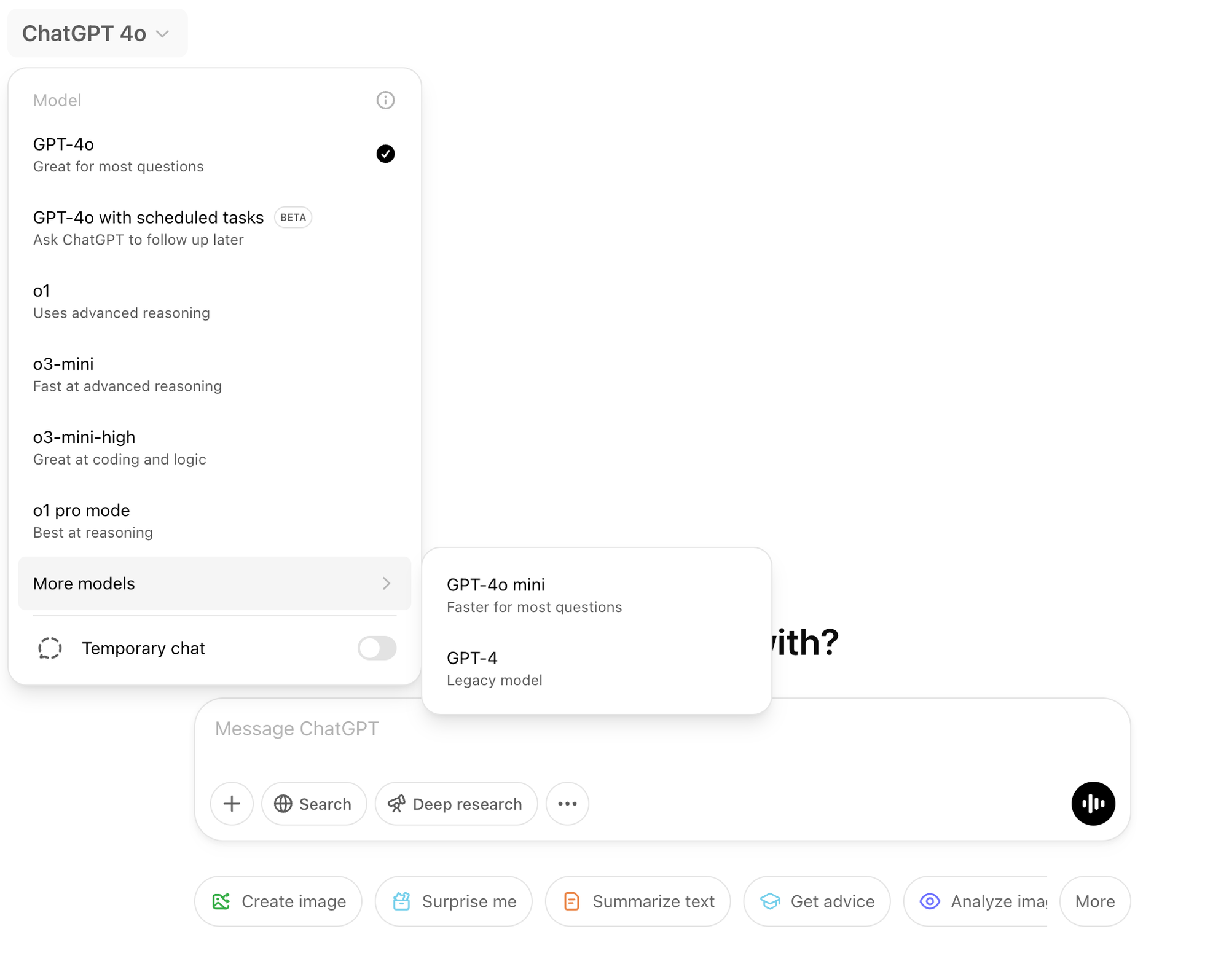 And depending on which model you choose to use, you get other options from there, as various buttons will be enabled in the message box for 'Web Search' and now 'Deep Research'. Oh and I forgot the '+' button, which has more options depending on where you're using it. And, of course, there's the '...' button in this box too, giving you a sub-menu for the 'Image' or 'Canvas' options. Oh yes, and Voice Mode. (And voice transcription on certain devices.)