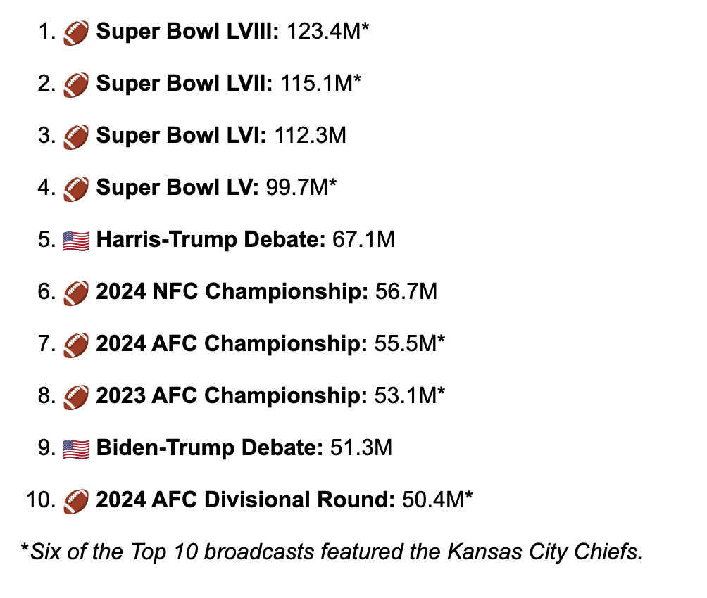 Fun that it sort of perfectly aligns where Biden-Trump beat out Division Rounds of the playoffs, but couldn't top the Championship games (though it apparently did top the 2023 NFC Championship). Whereas Harris-Trump beat out everything but the Super Bowls.