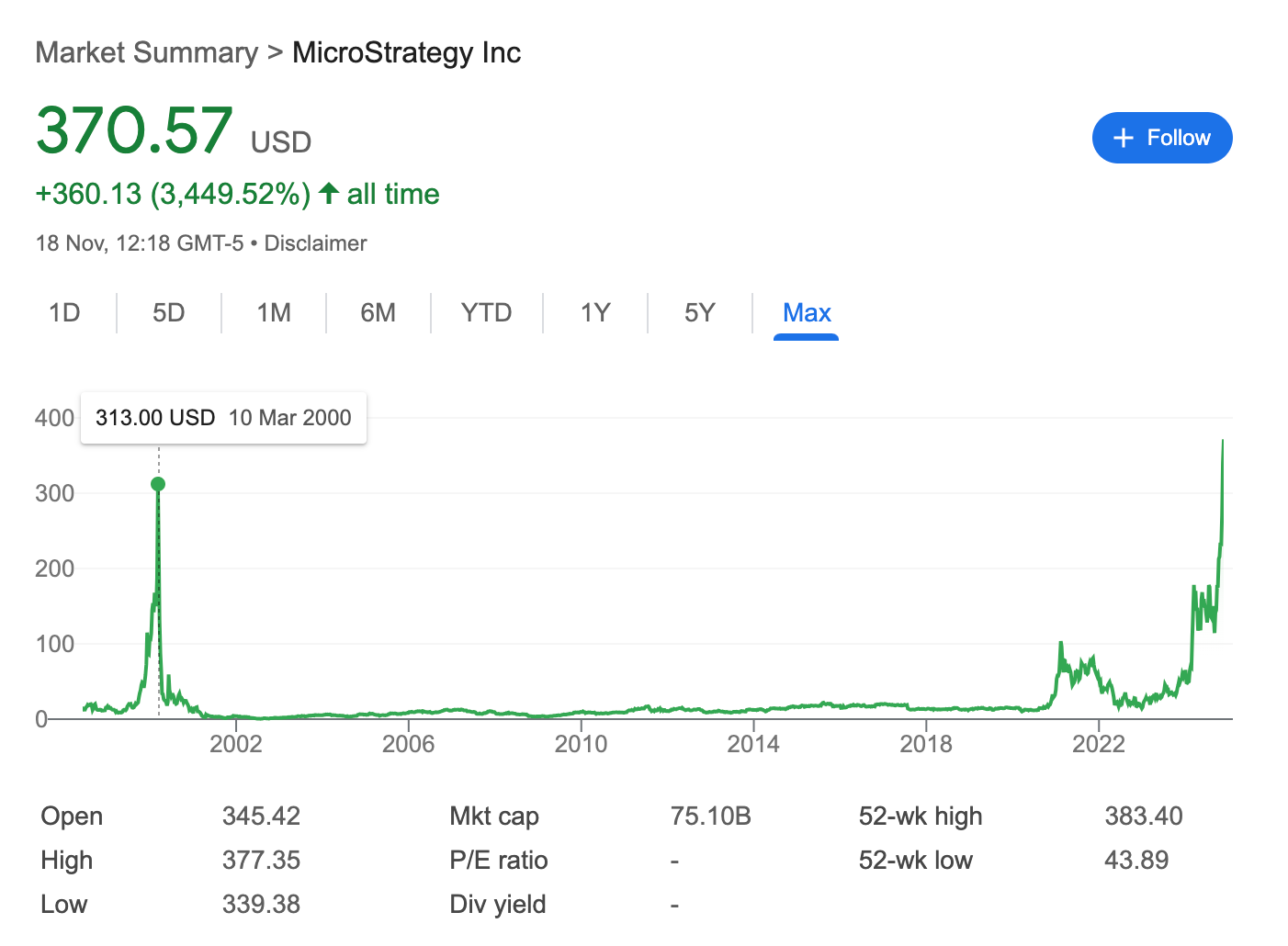 One of the most wild stock price charts you'll ever see. Per above, MicroStrategy's stock price peaked during the DotCom Bubble, nearly died in the collapse, pivoted to various things in enterprise software to stay alive, then went all-in on Bitcoin in 2020 to hedge against inflation. And they're still buying. 👀