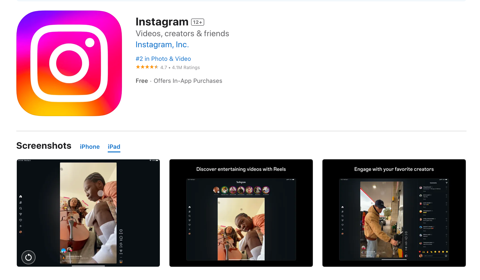 Yes, yes, you can find the photos feed. It took me a minute because it's buried in the second tab that looks like it should be for discovering friends but instead is for discovering Instagram, apparently. Once I found it, I started scrolling, thinking I could open up the images to take full advantage of the big, beautiful iPad screen. And nope.1 Because they simply no longer give a shit about such things.