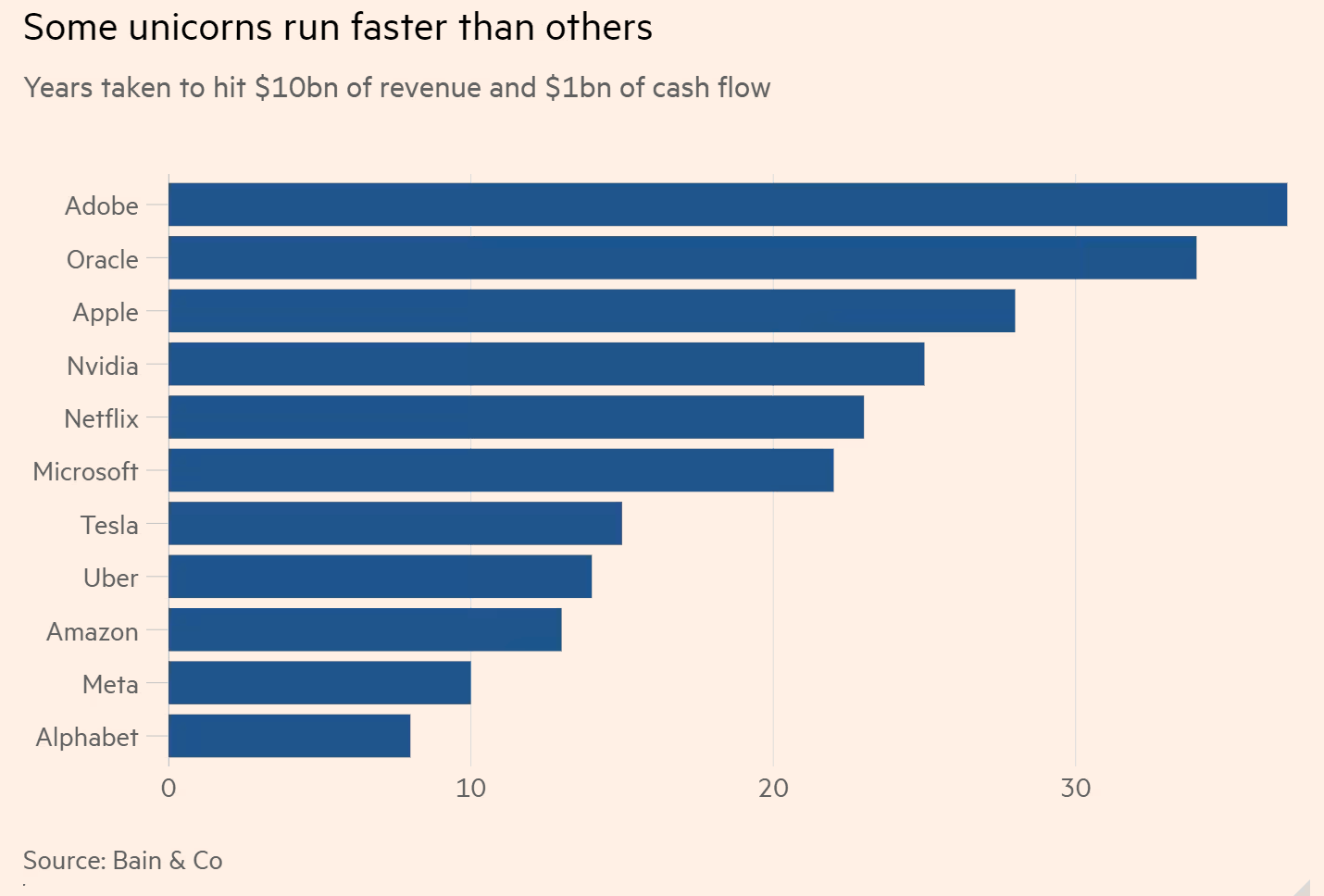 The Financial Times put together this chart with data from Bain & Co. The main gist of the piece in which it's included is that for all the "unicorns" birthed in the past two decades, not many can actually "fly" – at least by one definition, at least not yet: