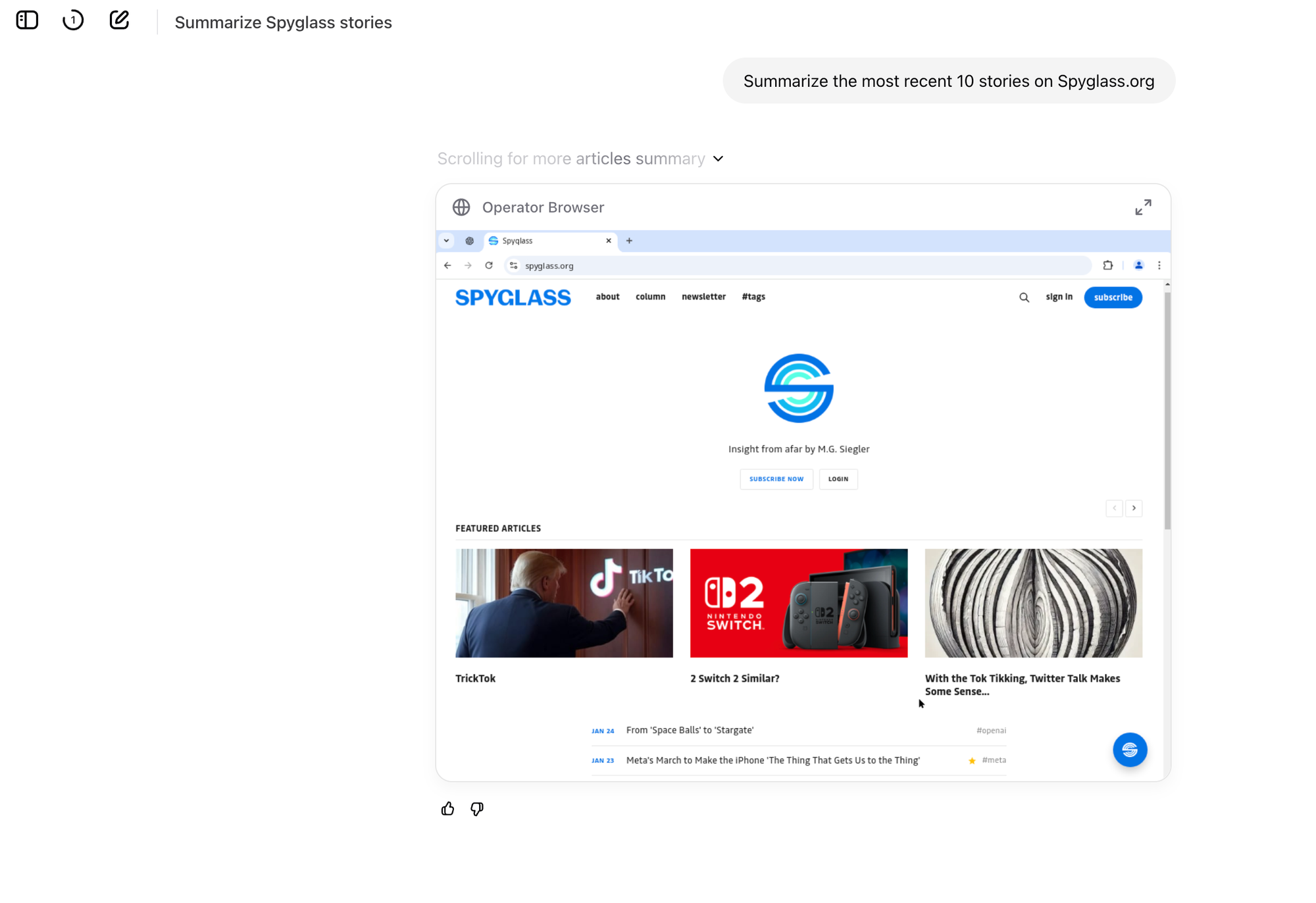 2 It was especially weird when I asked it to browse this site and summarize the most recent articles. And then when I stepped in to take over, which unfortunately seemed to trip-up my Operator, which then proceeded to try to re-size my site in its browser window for the next 10 minutes. Does my 'Operator' need glasses? Early days!