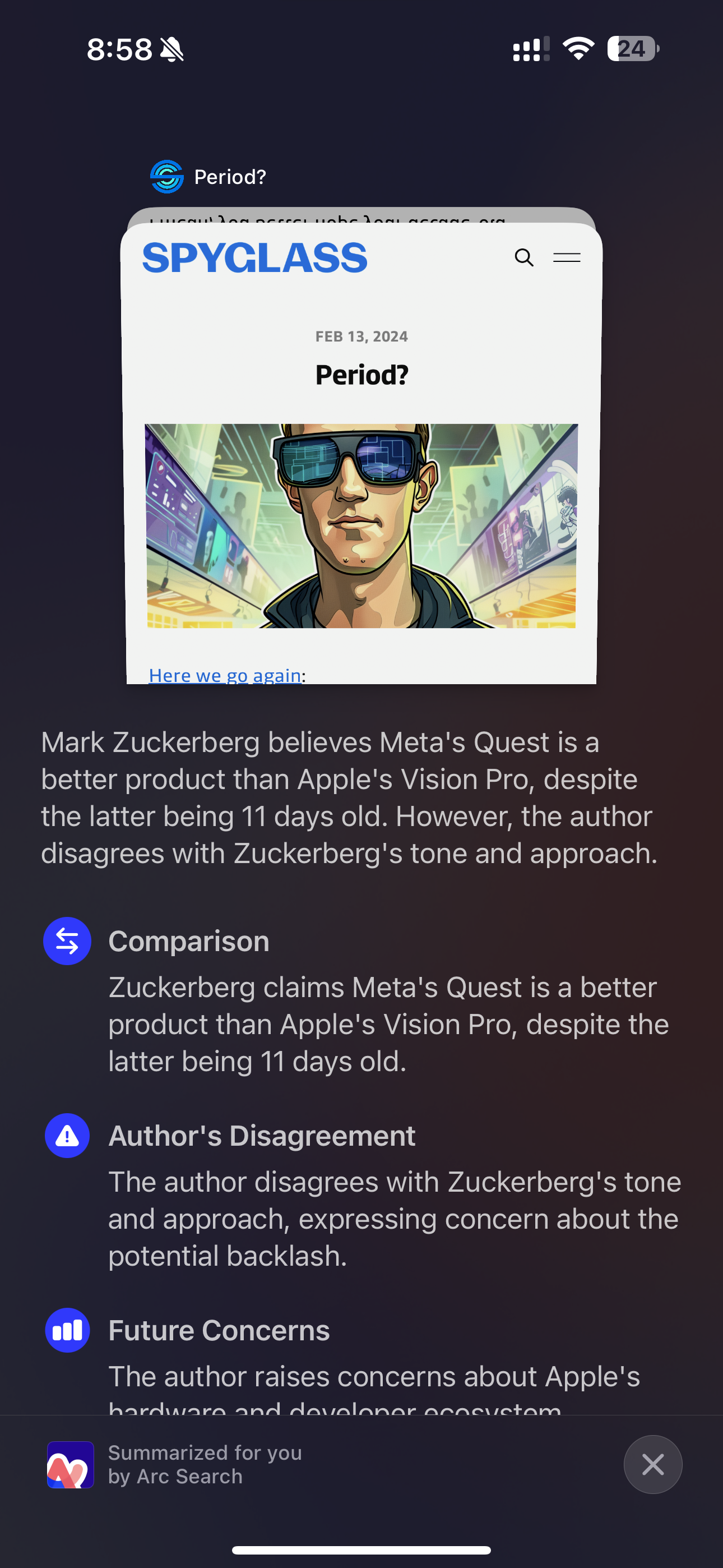 Speaking of, holy fucking shit this new UI/UX that Arc Search just dropped in their dot-release today is amazing. Truly. From the first time you use it, it just makes sense. You perform a pinch gesture on a web page and voilà! You get an AI generated summary of that page. It's so good that I'm certain it's about to be copied by everyone. Pinch-to-summarize is the new pull-to-refresh.1